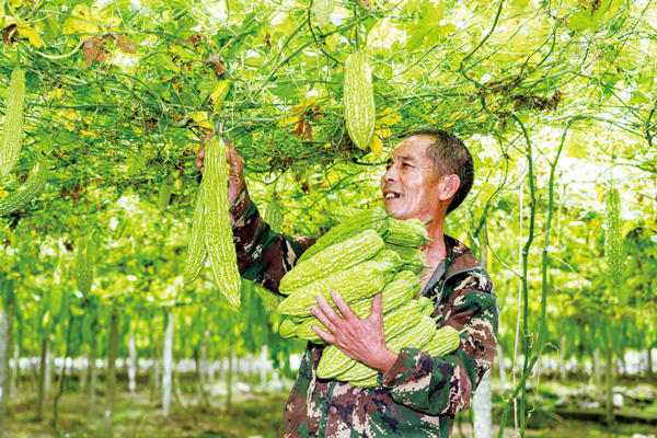 7月17日,在麗水市遂昌縣北界鎮白水村,碧綠的苦瓜掛滿藤架,種植戶笑逐顏開忙采摘。據金華市農科院科研人員介紹,今年共培育9個苦瓜新品種,其中“金秀309”為主打品種,具有產量高、抗性強、瓜體更亮更綠的特點?!?/a>