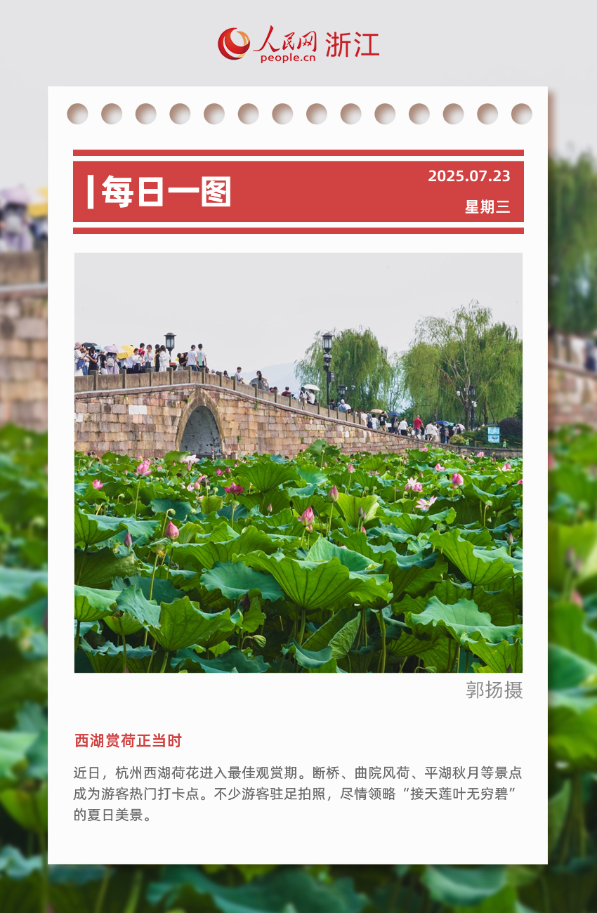 人民網杭州7月23日電 (記者郭揚、張麗瑋)近日,浙江杭州西湖荷花進入最佳觀賞期。西湖水域共有24塊荷區,總面積約150畝,目前開花率已達到五成左右?!?/a>