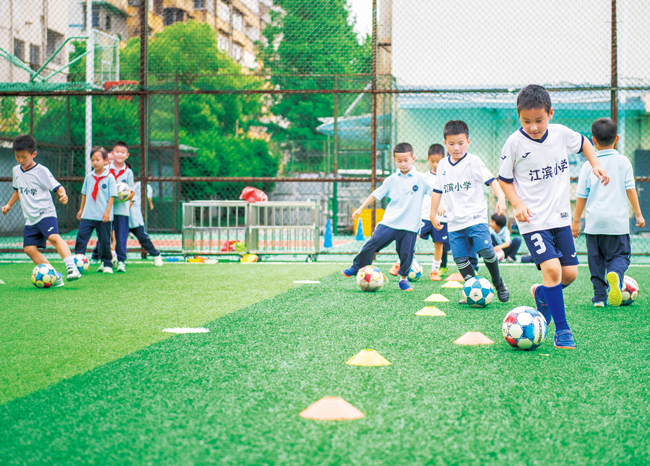 6月18日,金華市江濱小學校園內,各年級學生正分梯隊進行針對性訓練。作為全國足球特色學校,該校將足球訓練納入日常課程,旨在增強學生體質、放松身心?!?/a>