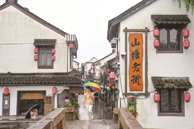 近日,在嘉興平湖市廣陳鎮山塘村“明月山塘”景區,游客前來游玩打卡,感受梅雨季江南老街風貌。 廣陳鎮山塘村北接上海金山區山塘村,兩村僅一橋之隔,為“同名村”?!?/a>