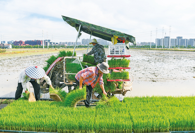 6月21日,在金華開發區蘇孟鄉后徐村農田里,農民忙著起秧,農機手駕駛插秧機栽種單季水稻。夏至時節,金華市各地農民搶抓農時忙農事,田間地頭一片繁忙景象?!?/a>