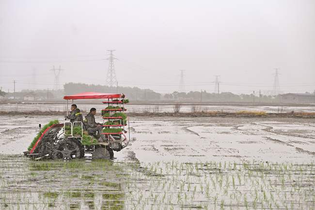 6月22日,在嘉興海寧市嘉海大道旁的一處水田,趁著當前雨水充足、氣溫適宜的有利條件,農戶駕駛著插秧機在田地里來回穿梭,給稻田披上新裝。(張啟帆)?!?/a>