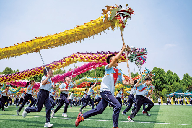5月27日,在金華義烏一所小學,1814名少先隊員齊聚操場,共同上演了一場別開生面的舞龍大課間活動。 活動現場共有30人制大龍6條和9人制大龍24條,其余學生人手一條彩帶龍?!?/a>