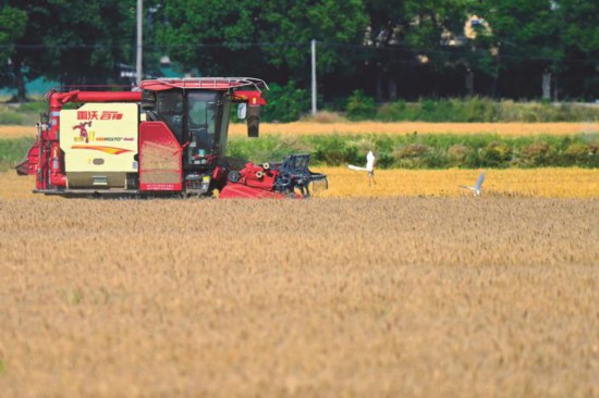 5月26日,在嘉興秀洲區新塍鎮火炬村的麥田里,收割機轟鳴作響,種糧大戶正搶抓晴好天氣收割麥子,確保夏糧顆粒歸倉。(俞中岳)?!?/a>