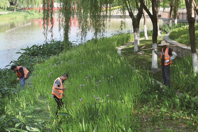 5月19日,在嘉興市秀洲區新塍塘綠道河邊沿岸,園林工人在烈日下給綠地除雜草,為市民打造美麗公園。(王蓉)?!?/a>
