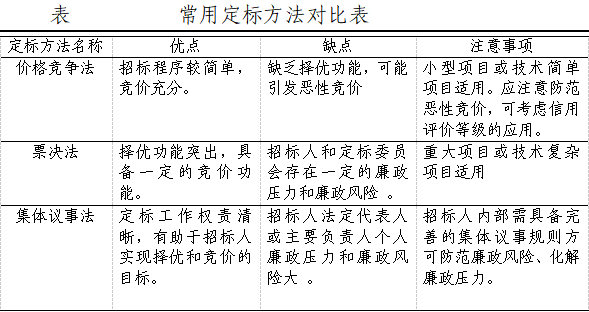。ǘ┚o扣擇優導向,促進精準定標。實現擇優目標的關鍵在于定標方法和定標因素。目前常用定標方法的優缺點及注意事項見表,招標人可以結合項目特點和自身實際,確定定標方法或定標方法組合,并在招標文件中予以明確和公開。當適用的定標方法不止一種時,招標人可在招標文件中列舉多種定標方法,在定標會議上通過隨機抽簽的方式確定最終定標方法。定標因素應包括投標人信用評價等級、投標報價、企業信譽、擬派團隊管理能力與水平等“正面因素”,對于串通投標、掛靠、在承接項目中發生重大工程安全事故等“負面因素”實行一票否決。