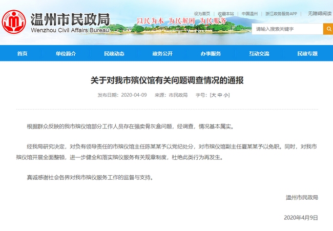 通報中提到,經當地研究決定,對負有領導責任的市殯儀館主任陳某某予以黨紀處分,對市殯儀館副主任夏某某予以免職。同時,對溫州市殯儀館開展全面整頓,進一步健全和落實殯儀服務有關規章制度,杜絕此類行為再發生。