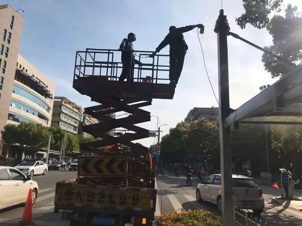 工作人員正在安裝非機動車智能遮陽棚系統。