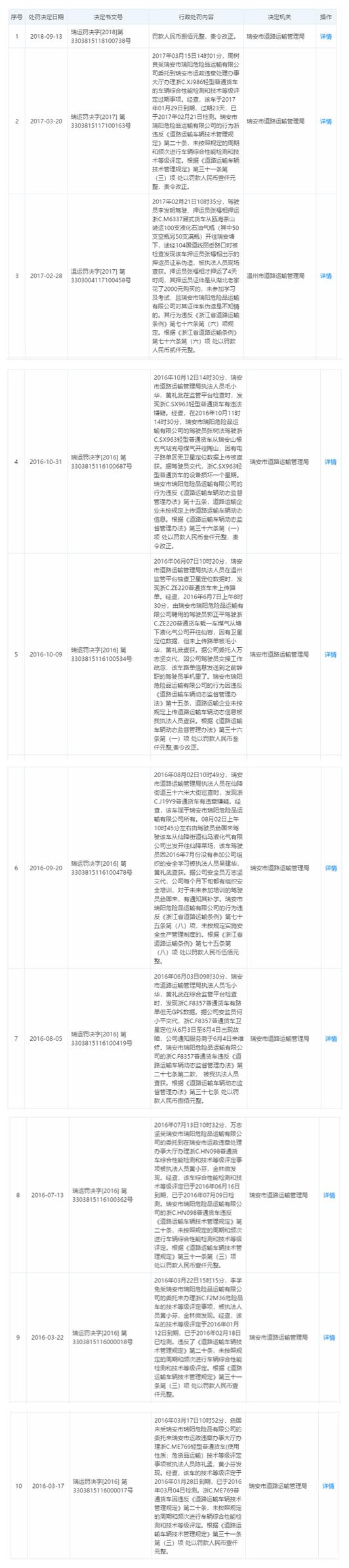 據數據顯示,涉事企業瑞安市瑞陽危險品運輸有限公司自2016年來已受到管理部門十次行政處罰。