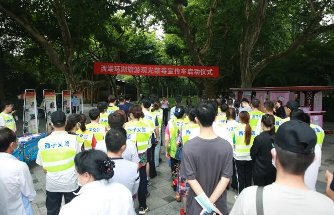 6月24日下午,在“6.26”國際禁毒日來臨之際,由杭州市公安局西湖風景名勝區分局禁毒辦舉行的“西湖環湖旅游觀光禁毒宣傳車”啟動儀式在西子湖畔啟幕。