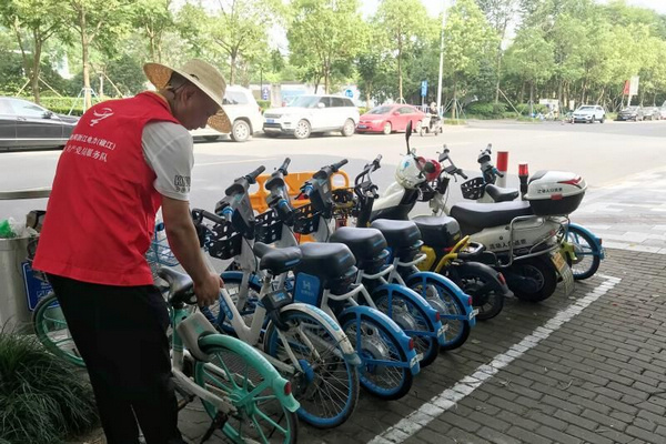 而在開發大道1001弄背街小巷里,王海龍和其余3名隊員正對亂堆放的雜物和隨意停放的車輛進行整理,勸導周邊群眾文明處理雜物,文明停放車輛,保障背街小巷整潔美觀,為城市增添一抹亮色。在星星廣場,隊員吳勝德正將道路周邊亂停亂放的共享單車進行了統一規范整理,將其整齊的擺放在非機動車道停放點,并向用車人員宣傳文明騎車、規范停車的理念,倡導市民文明用車,綠色出行。