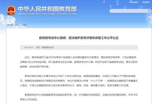 人民網杭州8月21日電 (王麗瑋)近日,媒體報道浙江省2020年高考個別閱卷人員涉嫌泄露考生作答情況、擅自使用評卷信息,個別命題教師涉嫌參與社會機構培訓等。浙江省高考為自主命題,教育部考試中心第一時間約談浙江省教育考試院,要求立即開展調查,依法依規嚴肅處理。