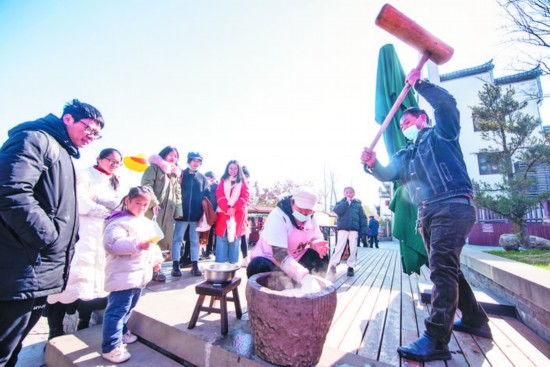1月1日,在金華市區婺州古城,打麻糍、手工石磨磨豆腐等傳統民俗慶新年活動吸引了眾多游客駐足觀賞體驗。元旦假期,從1月1-3日,市城投文旅公司在婺州古城和萬佛塔公園安排了豐富多彩的傳統民俗活動,歡慶新年。