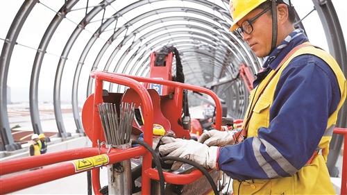 在李孟營的操作下,升降機慢慢將他托舉到聲屏障的鋼制構件上,他要把一個個半圓的預制鋼結構件用鋼板焊接固定在一起,再插入隔音板,這樣一個完整的半封閉聲屏障就逐漸成型。