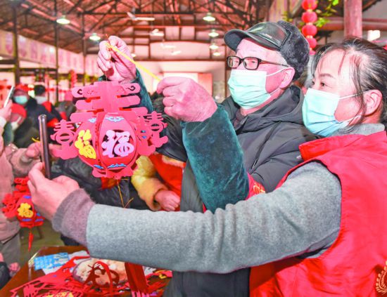 1月27日,在金華開發區羅埠鎮,金華市幸福家人公益協會的志愿者陪村中留守老人做燈籠,迎接春節的到來。