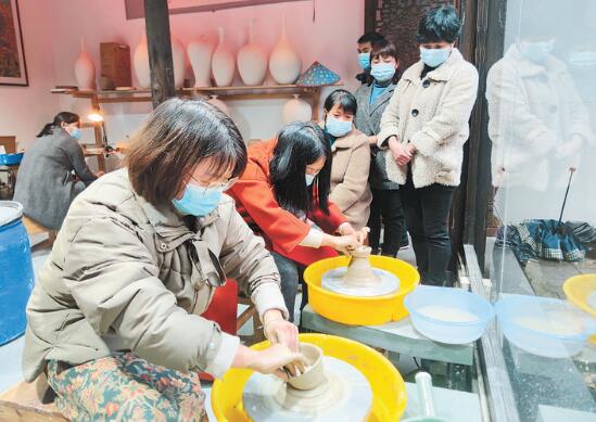 幾名游客在學習傳統非遺大漈罐制作。日前,麗水景寧大漈鄉高端藝術園“云中自在居”正式開園,該園的大漈罐體驗區受到各地游客的追捧,許多游客在游覽大漈獨特風景之余,都會選擇親身體驗一番傳統非遺大漈罐的制作。