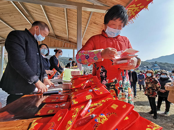 人民網寧波2月2日電 (王蕭蕭)日前,在浙江省寧波市象山縣茅洋鄉銀洋村眾籌旅游項目分紅現場,村民應鳳春接過一萬多元現金,滿臉幸福。她身后的村民有序排隊,村干部忙著清點現金、現場分發。全村106戶村民共分得137萬元的營收紅利。