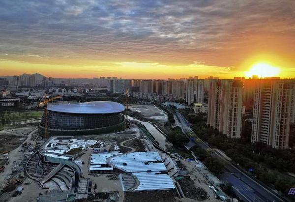春節期間,建設工地上還是一番熱火朝天的景象。目前,場館主體建筑已基本完工,工人們正在進行結頂操作。