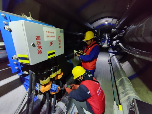 3月8日,在浙江紹興供電公司220千伏電纜通道內,高壓電纜班員工陳嘯和同事正在對安裝在220千伏蘭渡2461線、蘭東2462線的“電纜智慧耳”進行調試。