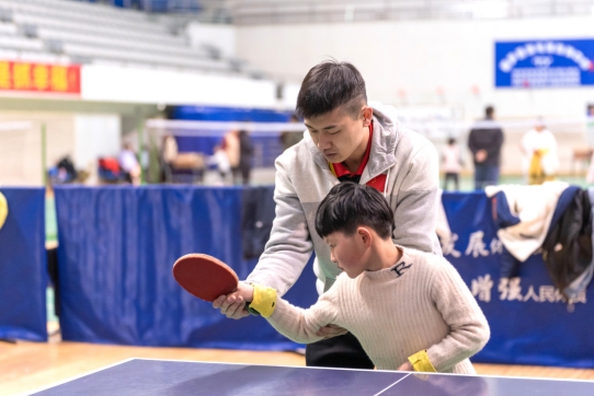 諸佳輝指導學生打乒乓球。黃曉燕攝