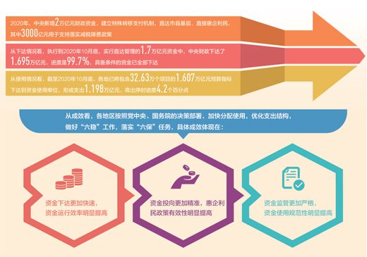 今年3月初,財政部調研小組發布的《2020年中國財政政策執行情況報告》顯示,直達資金執行情況總體良好,“僅用20天時間,就將95%的中央直達資金下達市縣基層,省級財政細化下達時間平均只有1周,速度前所未有!薄澳壳,財政直達資金預算下達已經完成,其中1.56萬億元資金已經投入使用,預算執行情況總體良好,重點領域支出保障有力,效果明顯!