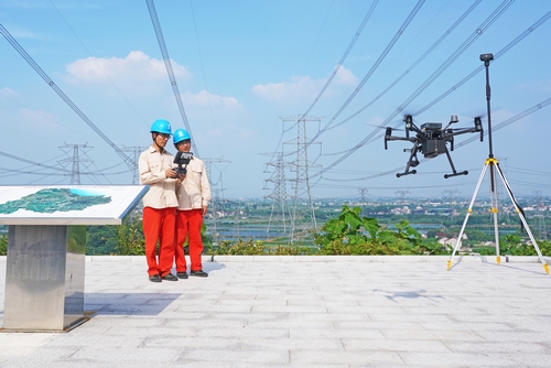 國網湖州供電公司輸電運檢人員正在用無人機對特高壓線路進行巡視。姚羽霞攝