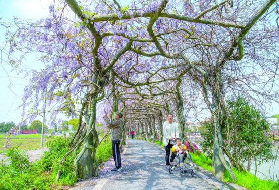3月22日,在金華金義新區嶺下鎮釜章村,八仙溪邊的百米紫藤花長廊上的花朵開放,花枝從架上垂下,像掛滿了串串紫色風鈴,吸引了一撥撥游人前來游覽拍照。釜章村黨支書記章金元介紹,今年紫藤花開放比去年早了一個星期,花期持續到4月上旬。紫藤花長廊成為該村莊的特色景點,與積道山、八仙溪、釜章村串起了一條鄉村旅游線,游客主要來自市區和永康、義烏、武義等地。(時寬兵)