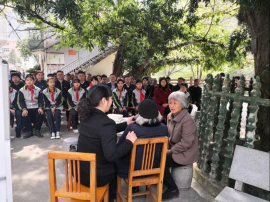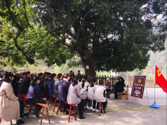 3月23日上午,在文成縣峃口鎮峃口村丁埠頭邊的一棵百年竹柏樹下,峃口鎮黨員干部、離退休老干部、年輕黨員發展對象、學生代表等60余人緊緊圍坐在一起,共同聆聽百歲老黨員陳阿翠講述革命歷史,回顧入黨初心。