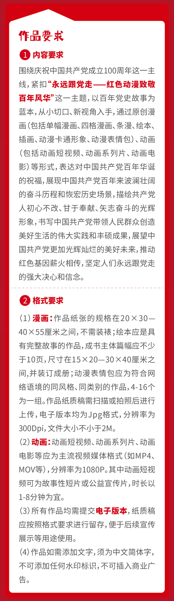 本次活動面向全國動漫從業人員、專業人士和動漫愛好者征集作品,旨在圍繞慶祝中國共產黨成立100周年這一主線,以百年黨史故事為藍本,從小切口、新視角入手,通過原創漫畫(包括單幅漫畫、四格漫畫、條漫、繪本、插畫、動漫卡通形象、動漫表情包)、動畫(包括動畫短視頻、動畫系列片、動畫電影)等形式,表達對中國共產黨百年華誕的深深祝福,展現中國共產黨百年來波瀾壯闊的奮斗歷程和恢宏歷史場景,描繪中國共產黨人初心不改、甘于奉獻、矢志奮斗的光輝形象,書寫中國共產黨帶領人民群眾創造美好生活的偉大實踐和豐碩成果。
