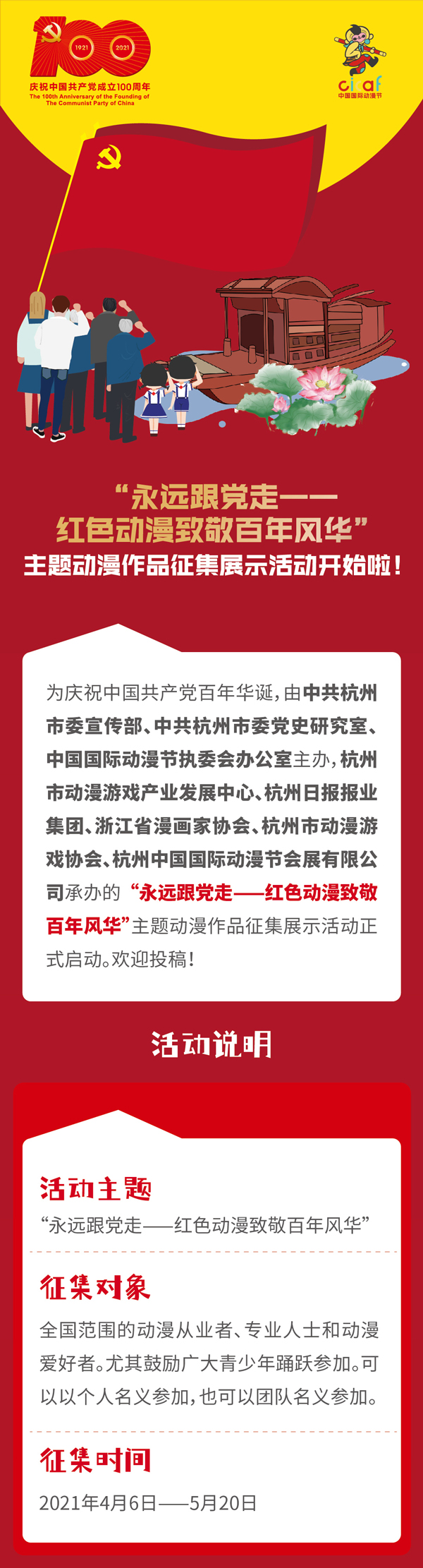 人民網杭州4月6日電 (王蕭蕭)為慶祝中國共產黨百年華誕,“動漫之都”杭州于今日正式啟動“永遠跟黨走——紅色動漫致敬百年風華”主題動漫作品征集展示活動。