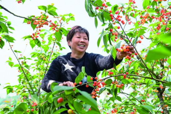 4月6日,在金華金義新區赤松鎮虎巖村,村民忙著采摘櫻桃。村民汪柳琴家中有4畝櫻桃。她說,目前已經成熟的櫻桃叫“短柄”,采摘期比上年提前了一周左右;4月下旬,晚熟品種“黑珍珠”也將成熟,采摘期可延續到5月中旬。據了解,今年是櫻桃豐收大年,一畝產值可達兩萬余元。赤松鎮虎巖村有櫻桃千畝左右。(時寬兵)