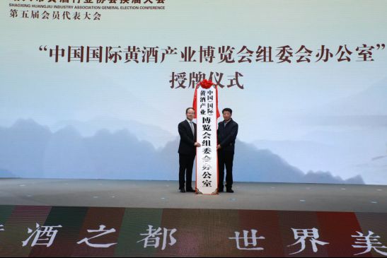 徐明光(左)接受中國酒業協會執行理事長王琦(右)對紹興市黃酒行接協會成為“中國國際黃酒產業博覽會組委會辦公室”的授牌。沈鴻泉攝