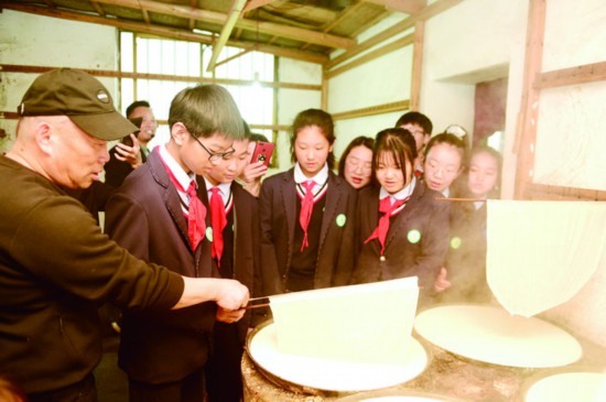 “哦,原來豆腐皮是這樣撈出來的!”日前,在豆腐皮之鄉——浙江義烏后宅街道上金村一農戶家中,陣陣豆香從灶臺上飄出,54歲的張偉民正在展示撈豆腐皮技藝,邊上小朋友看得聚精會神。當天,浙江義烏市江灣小學606班、東方武館的小朋友們先后來到該村研學,學習制作豆腐皮。 上金村黨支部書記張枝喜說,該村制作豆腐皮已經有300多年歷史,上世紀六七十年代,家家戶戶都撈豆腐皮,由于比較辛苦,效益不高,傳承撈豆腐皮手藝的人越來越少。目前,村里大力發展豆制品產業,在引進現代化生產設備的同時,也想方設法把老技藝傳承下去。(錢旭升)