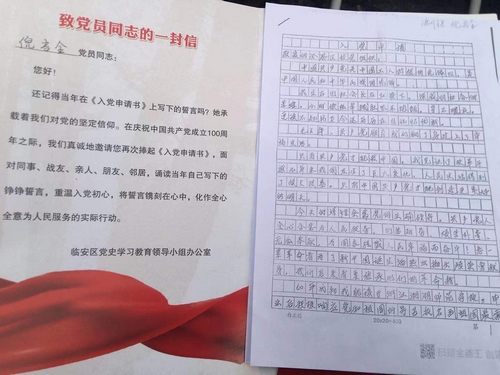 人民網杭州4月15日電 (王麗瑋、金忠耀、王蕭蕭)“我迫切希望加入中國共產黨,堅定聽黨話,永遠跟黨走……”看著三十多年前的筆跡,老黨員倪吾全十分感動。今天,杭州臨安慶祝建黨100周年“百千萬”主題活動正式啟動;顒悠陂g,臨安上萬名黨員將收到一份“紅色禮物”——裝著自己當年入黨申請書的紅色信封,重溫入黨初心。