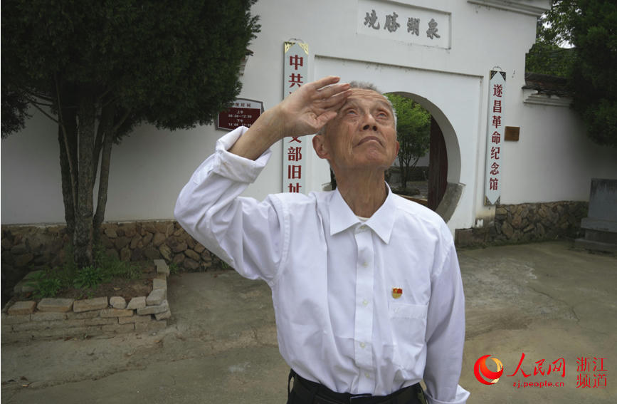 一位滿頭白發的老人,獨自拿著五星紅旗,緩緩走向旗桿,再小心翼翼將旗系在旗桿上,站直身體,右手把旗用力向外一拋……這一幕,每天都會在浙江遂昌革命紀念館前的小廣場前上演。