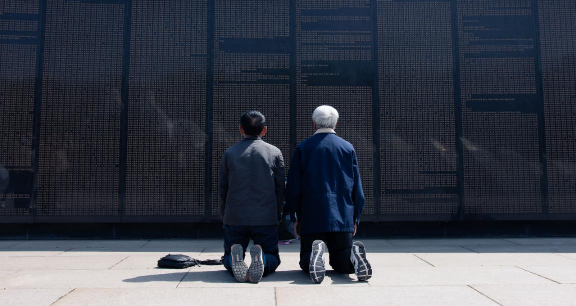 金伍星與金云星跪在刻有父親名字的英名墻前。人民網 邱宇哲攝