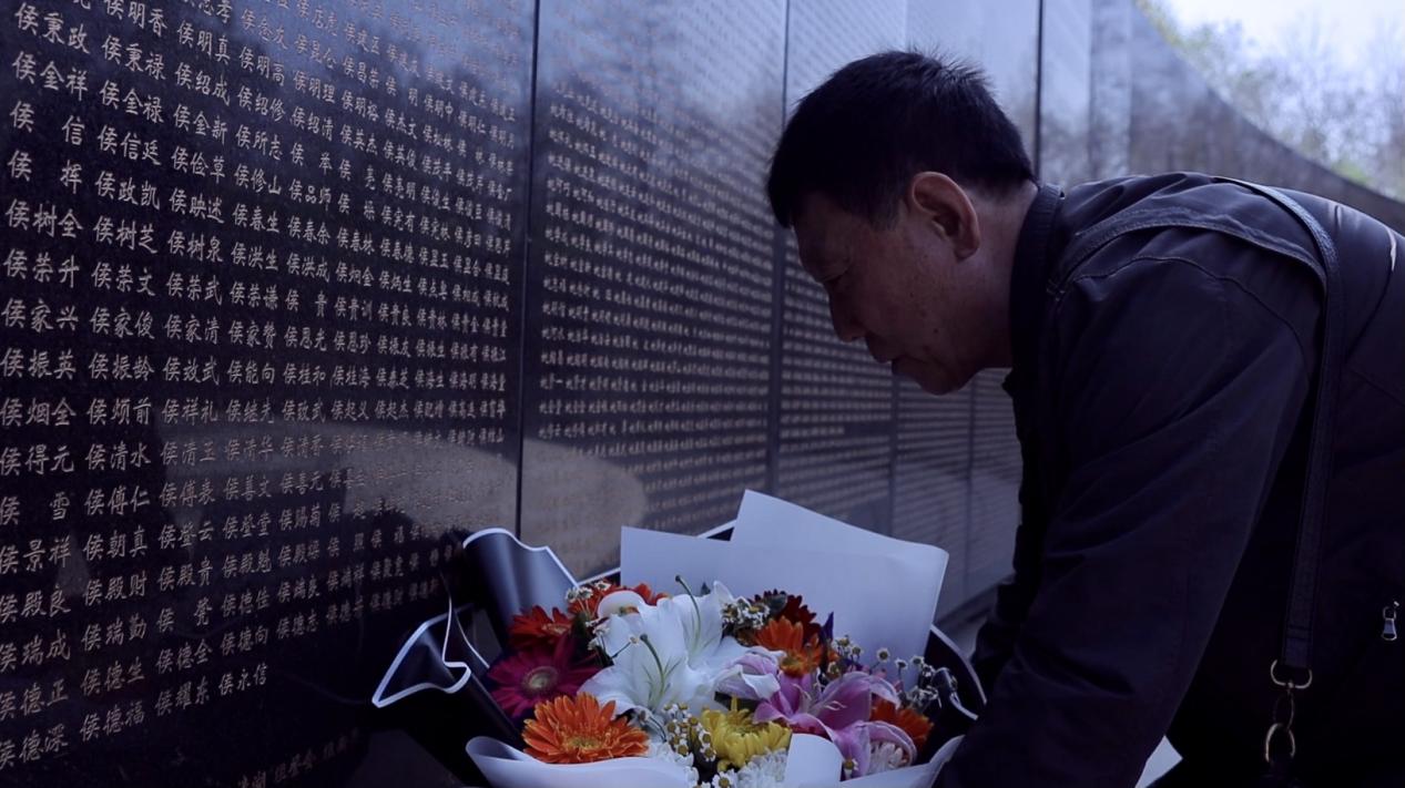 金云星把一束鮮花放在英名墻下。人民網 邱宇哲攝