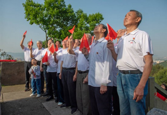 此刻,除了升旗手,炮臺山頂的所有人立即面向冉冉升起的五星紅旗肅立,在向鮮艷的國旗行注目禮的同時,大家還紛紛唱響了國歌,目送它徐徐地升到桿頂,在炮臺山頂迎風飄揚。 他們中年紀最大的80歲,最年輕的也有62歲。2018年10月1日,老人們第一次在炮臺山舉行莊重的換旗、升旗儀式。