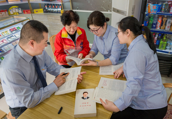 建德市煙草專賣局黨員與零售戶共讀紅色書籍。黃兆鈞攝