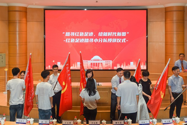 活動現場,與會領導嘉賓為37支紅色足跡踏尋小分隊授旗。人民網 張帆攝