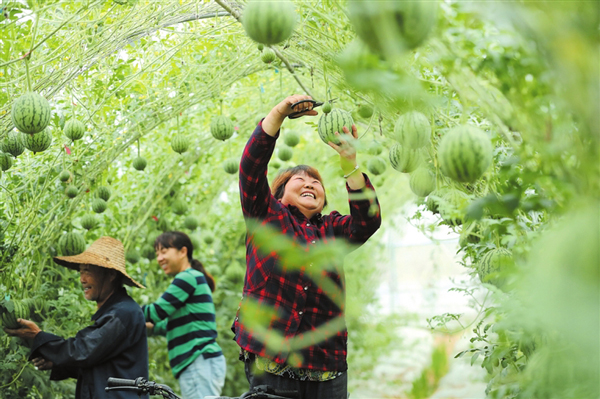 5月12日,湖州德清縣康乾街道的新田瓜蔬種植基地,瓜農正在采摘“空中西瓜”。該基地采用隧道棚攀爬栽培技術種植的網架西瓜陸續成熟,瓜形漂亮,甜度更高,提高了土地利用率和產出率,效益比普通西瓜高出近一半。該基地與浙江大學合作建立西瓜新品種產業化基地,將自動滴灌、遠程數據采集、智能電力溫控等技術應用于農業生產,推動瓜蔬種植現代化、智能化,助力鄉村振興。(謝尚國)