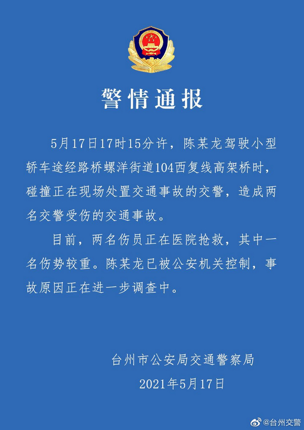 17日,臺州市公安局交通警察局工作人員表示,撞傷交警的肇事司機姓陳,當時駕駛一輛特斯拉車。2名受傷交警目前仍在醫院搶救治療,其中1人傷勢較重。
