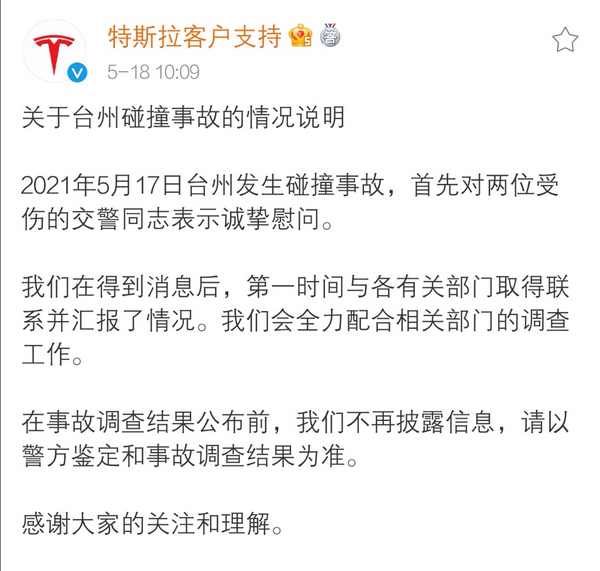 5月18日,特斯拉汽車(北京)有限公司發布情況說明稱,對兩位受傷的交警同志表示誠摯慰問。