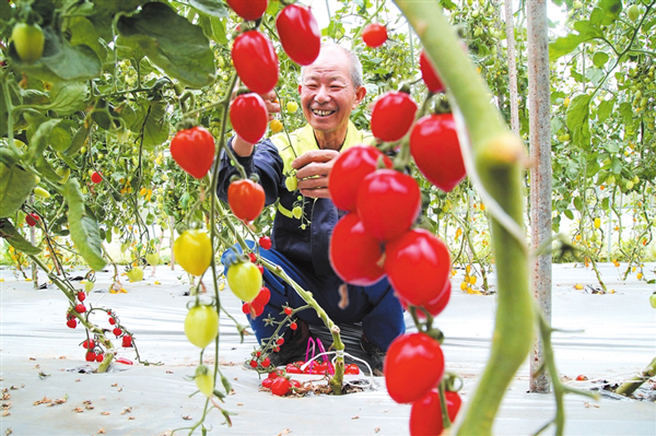 湖州南潯區石淙鎮三零現代農業示范園,工作人員日前正在大棚采摘彩色小番茄。近年來,當地農業部門引入彩色小番茄品種,外觀獨特,一色一味,市場價較傳統番茄貴,助力村民增收。(張斌)