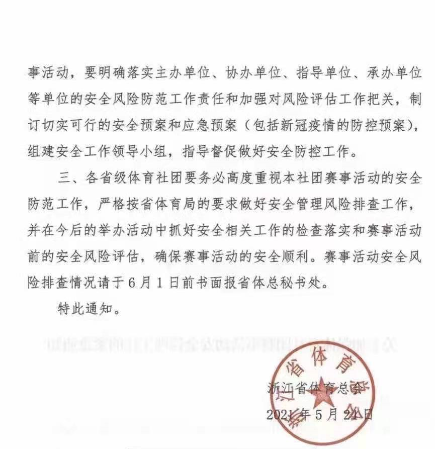 人民網杭州5月24日電 (艾宇韜)5月24日,浙江省體育總會緊急發布了《關于加強體育社團賽事活動安全管理工作的緊急通知》(下簡稱《通知》),暫停中長跑和越野賽有關賽事活動舉辦,具體恢復時間等候省體育局通知。