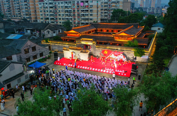 “我林泗齋、我王寶珩、我金毅成,我自愿加入中國共產黨,犧牲個人,努力革命...”,夜晚的五洞橋流光溢彩,在中共臺屬特委機關舊址前的廣場上,演員們身著布衣,通過人物塑造和角色設置,以獨白、旁白、演繹穿插的形式再現了“黃巖第一個黨支部”成立和活動的歷史場景,將那段崢嶸歲月活靈活現地搬到了舞臺上。
