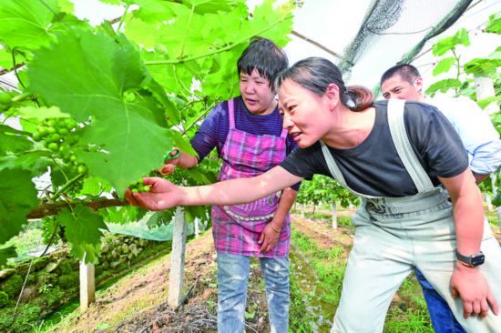 5月24日下午,雨后天晴,金華永康市前倉鎮舜耕農莊,市科技特派員永康服務團在田頭指導果農防治雨期葡萄病害。金華市自2003年推行科技特派員制度以來,科技特派員走出實驗室,深入田間地頭,做給農民看、帶著農民干,累計實施項目2000多項,引進推廣新技術4800多個。(胡肖飛)