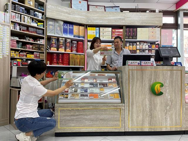 杭州市煙草局工作人員在店內指導零售戶張貼“不向未成年人售煙”標志。方昕攝