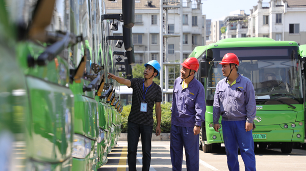 在紹興市公交集團公司公交充電站,公交集團工作人員在向電力人員介紹目前紹興市充電汽車運行情況。許楊攝
