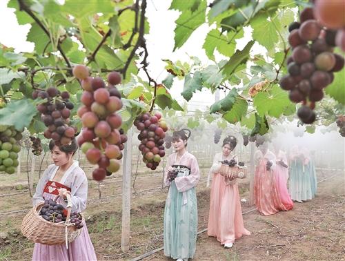 6月5日上午,臺州溫嶺濱海鎮第三屆葡萄節暨“溫嶺葡萄”地標品牌推廣大會舉行,會上該鎮不但與古茗奶茶簽訂了合作供貨協議,還啟動了濱海葡萄園區創建省級青創農場示范點工作。濱海鎮是我國大棚葡萄之鄉,也是全國最大的大棚葡萄生產基地。圖為當天,幾名穿著漢服的女子在大棚內采摘葡萄。(孫金標)